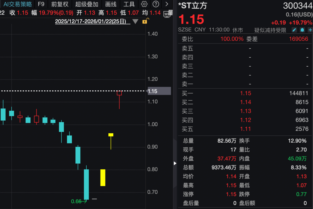 实控人通过非公告渠道发布公开信,重大违法退市及面值退市风险悬顶的*ST立方(300344)股价连续三天“20cm”涨停,最新报1.15元/股,三天累计涨幅超过70%。