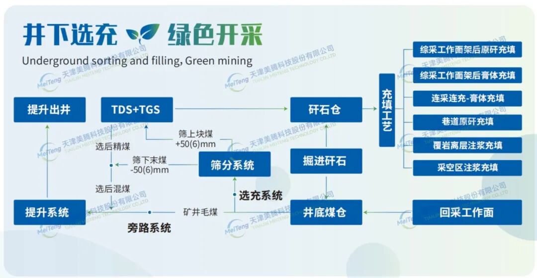 美腾井下“选-充”一体化解决方案正是这一新思路的完整工程实践。通过井下分选矸石并直接在井下充填,可实现矸石不升井、置换压覆资源,这一实践不仅从根源上减少了地面固体废物的产出与堆存,更通过充填技术解放了宝贵的三下压覆煤炭资源,直接破解了矿井产能接续的难题,将环保压力转化为显著的经济效益,为煤炭企业的高质量发展提供了关键的破局路径。