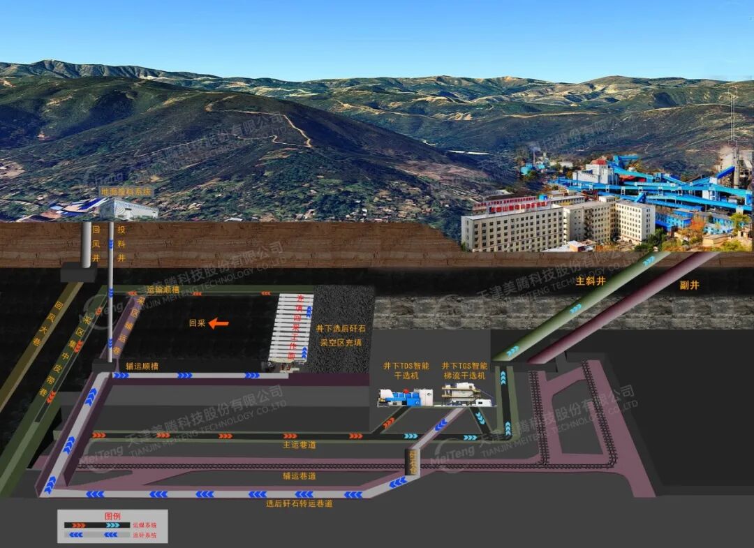 美腾研发的井下TDS智能干选机,是将井下毛煤经过筛分后,块煤进入干选机,通过X光、图像等识别技术,将煤、矸准确识别,并通过高压风将其分开。可实现井下300-10mm的原煤深度排矸,并利用选后矸石进行充填开采,根据各矿井不同的需求,可置换矿井边角煤及三下压覆资源,提高矿井资源回收率延,长服务年限,增加经济效益。