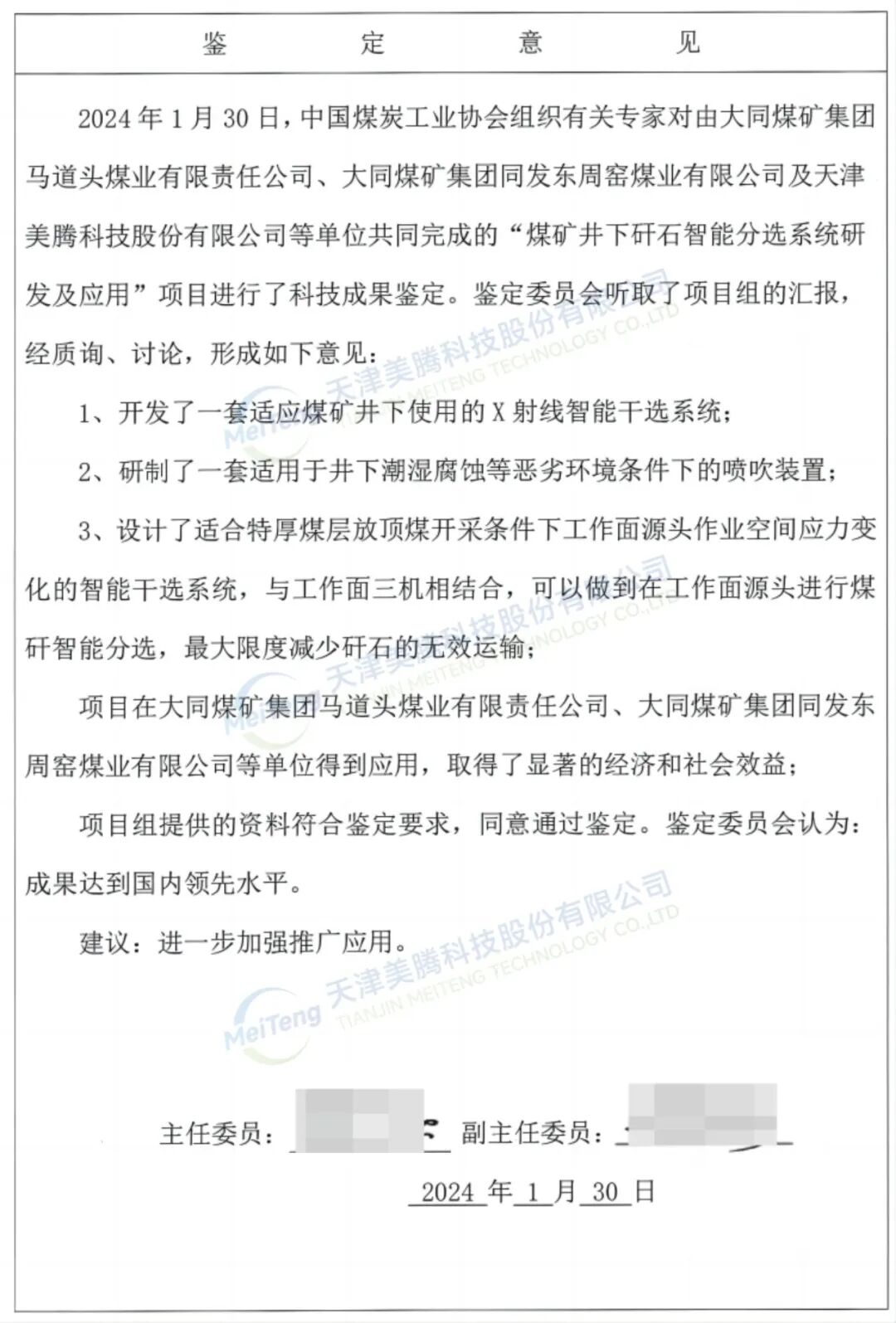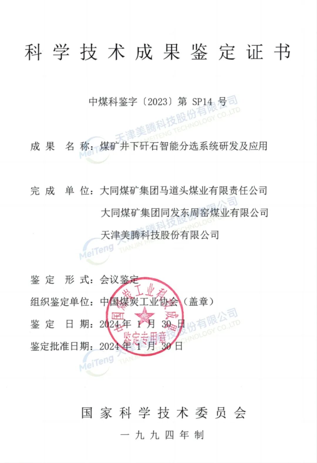 “煤矿井下矸石智能分选系统研发及应用”项目,经中国煤炭工业协会鉴定:成果达到国内领先水平。