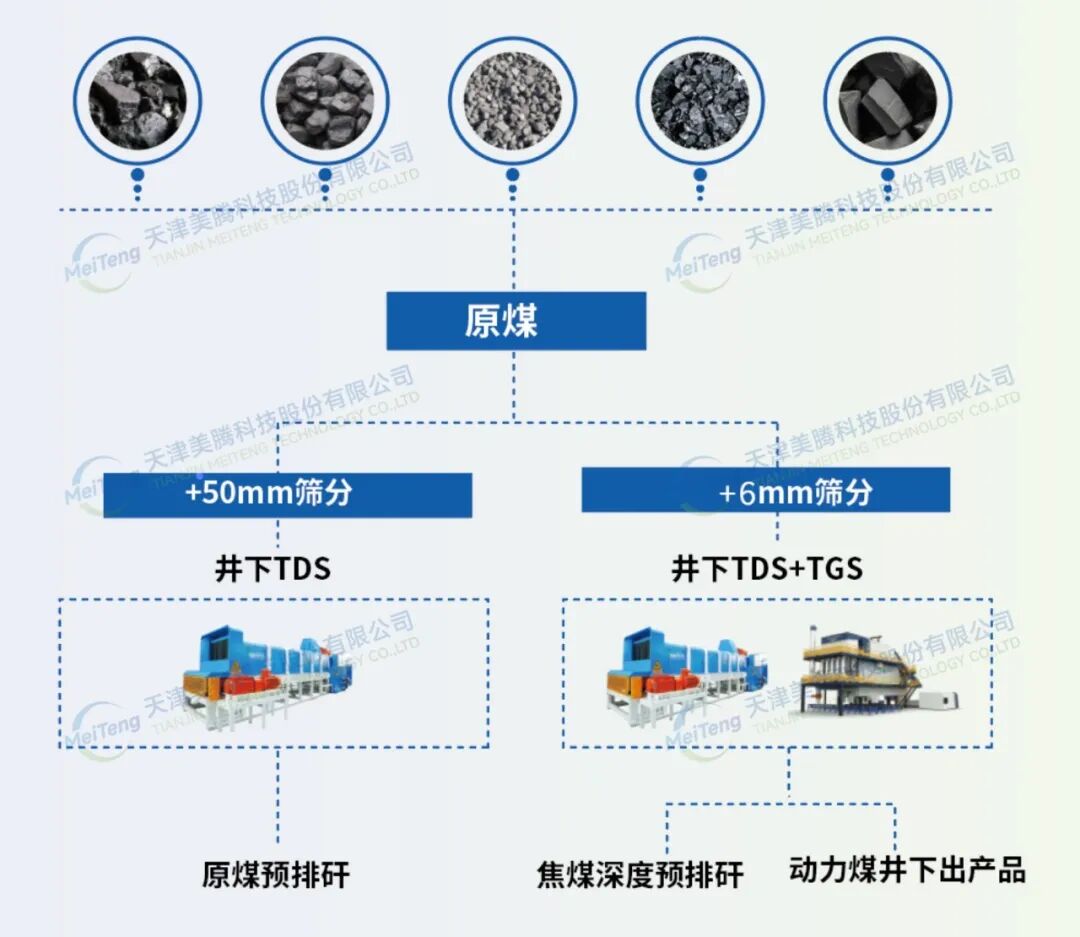 目前美腾研发的TGS可对50-10(6)mm末煤进行分选,与TDS配合实现6mm以上矸石不升井。井下TDS+TGS全干选工艺可以实现焦煤井下深度预排矸、动力煤井下排矸升井即产品。