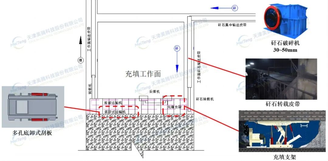 01.工作面架后原矸充填:系统包括矸石皮带、专用充填支架与架后刮板输送机等。矸石破碎至50mm以下后,经皮带运至支架后的多孔底卸式输送机,通过卸料孔落矸,再由支架捣实装置压实,提高充实率。