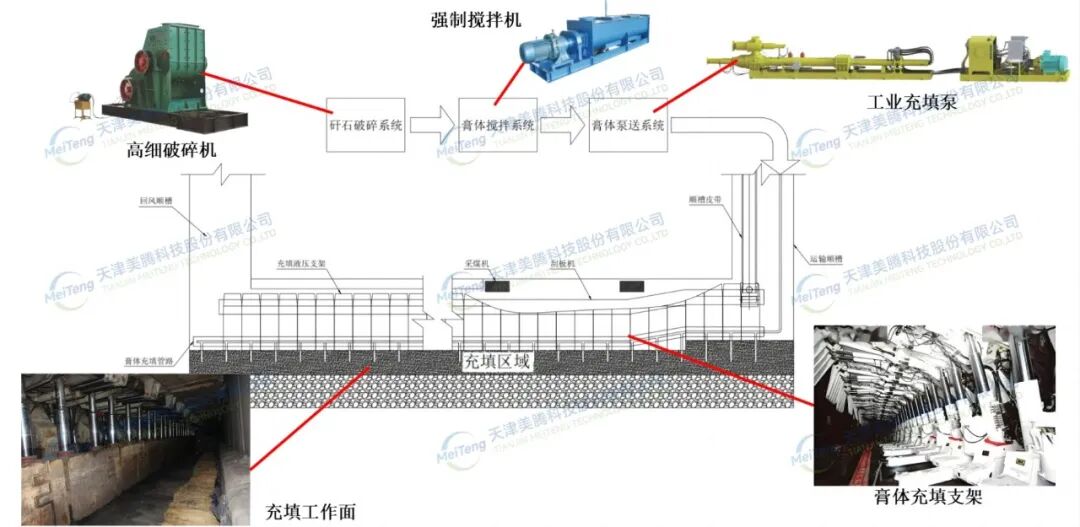01.工作面架后膏体充填:系统由破碎、搅拌与泵送三部分组成。矸石经破碎后,与混凝土、粉煤灰等按比例搅拌成膏体,通过充填泵经管路输送至综采工作面架后采空区。