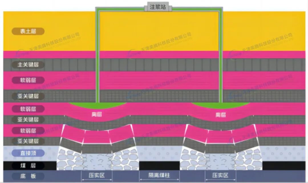 01.覆岩离层注浆充填:向采后覆岩离层区高压注入矸石浆液,形成“离层区充填体+关键层+煤柱”共同承载体,能有效减缓地表沉降,并可实现采充平行作业,但对地面钻孔条件要求较高。