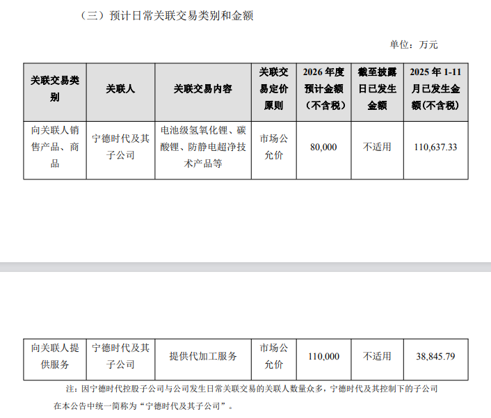 天华新能预计,2026年度,公司向宁德时代及其子公司提供代加工服务金额约为11亿元,超过公司计划向宁德时代直接销售的锂盐等产品金额8亿元。