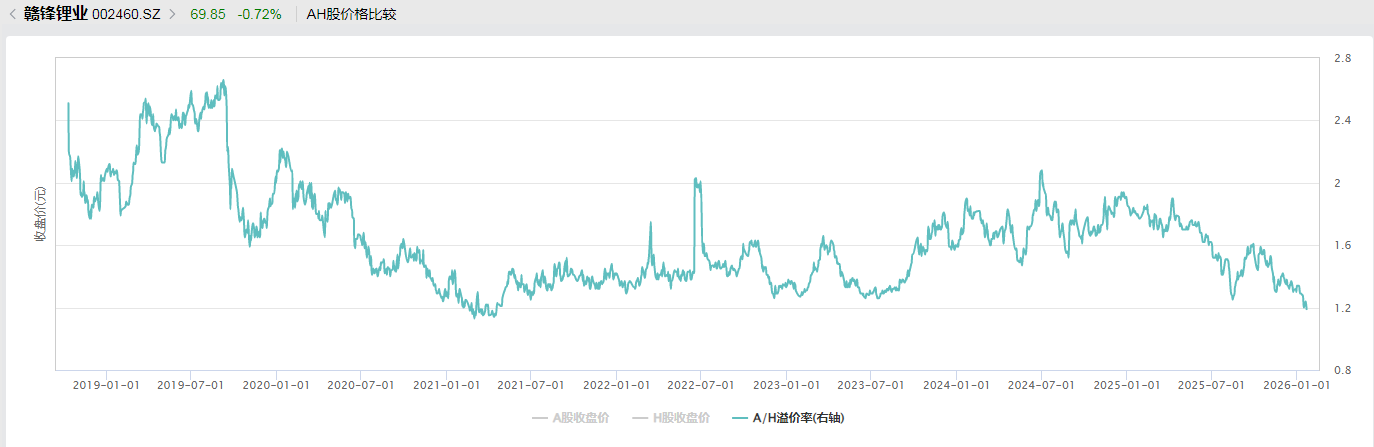 数据显示,赣锋锂业港股上市初期,A/H溢价率一度超过2.5倍,此后长期保持在1.5倍上下波动,但自2025年以来该指标持续走低。