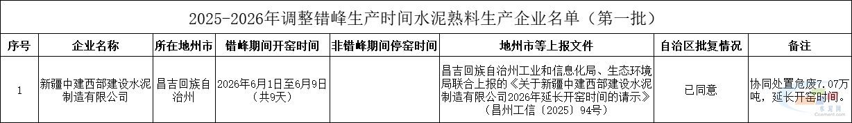 根据名单显示,新疆中建西部建设水泥制造有限公司错峰期间开窑时间为2026年6月1日至6月9日(共9天),协同处置危废7.07万吨。