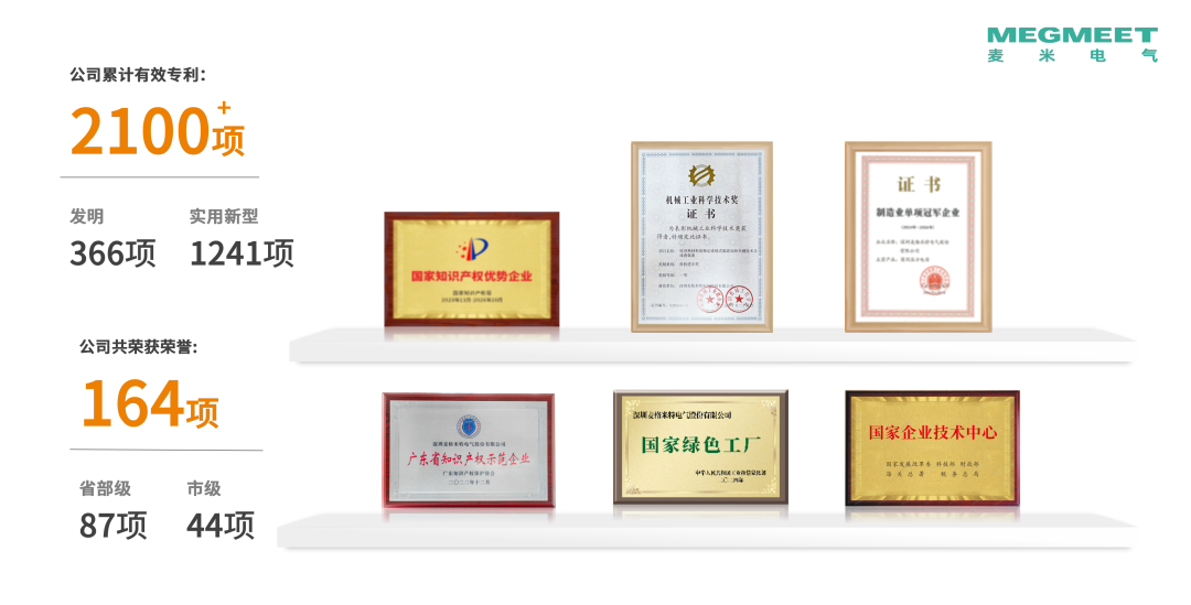 凭借扎实的技术积累与规范化管理,麦米电气已获得国家级高新技术企业、国家知识产权优势企业、国家制造业单项冠军企业、国家机械工业科学技术奖科技进步奖一等奖等多项国家级荣誉。