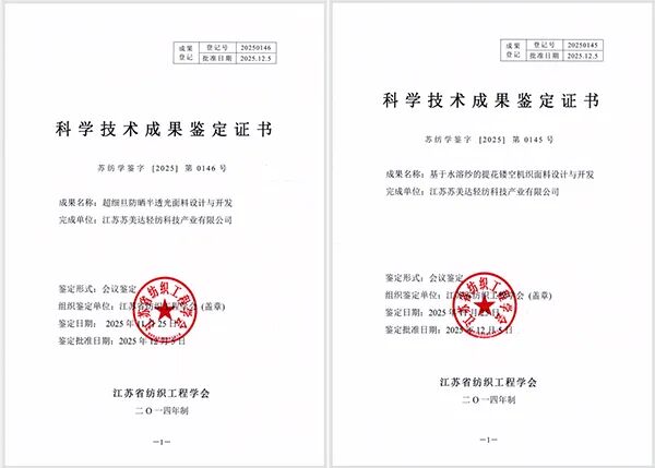 近日,轻纺公司旗下江苏苏美达轻纺科技产业公司研发的“超细旦防晒半透光面料设计与开发”和“基于水溶纱的提花镂空机织面料设计与开发”两项科技成果顺利通过江苏省纺织工程学会鉴定,技术达到国内领先水平。