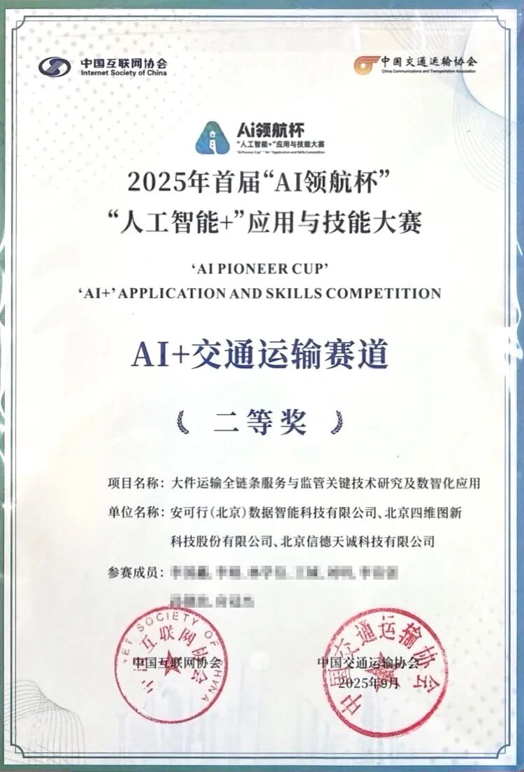近日,由中国交通运输协会与中国互联网协会联合主办、交通运输部科学研究院提供技术支持的首届“AI领航杯”全国“人工智能+”应用与技能大赛获奖名单揭晓。四维图新(002405)联合安可行(北京)数据智能科技有限公司、北京信德天诚科技有限公司打造的“大件运输全链条服务与监管关键技术研究及数智化应用”项目,凭借技术创新性与行业实用性,成功斩获AI+交通运输赛道全国二等奖。