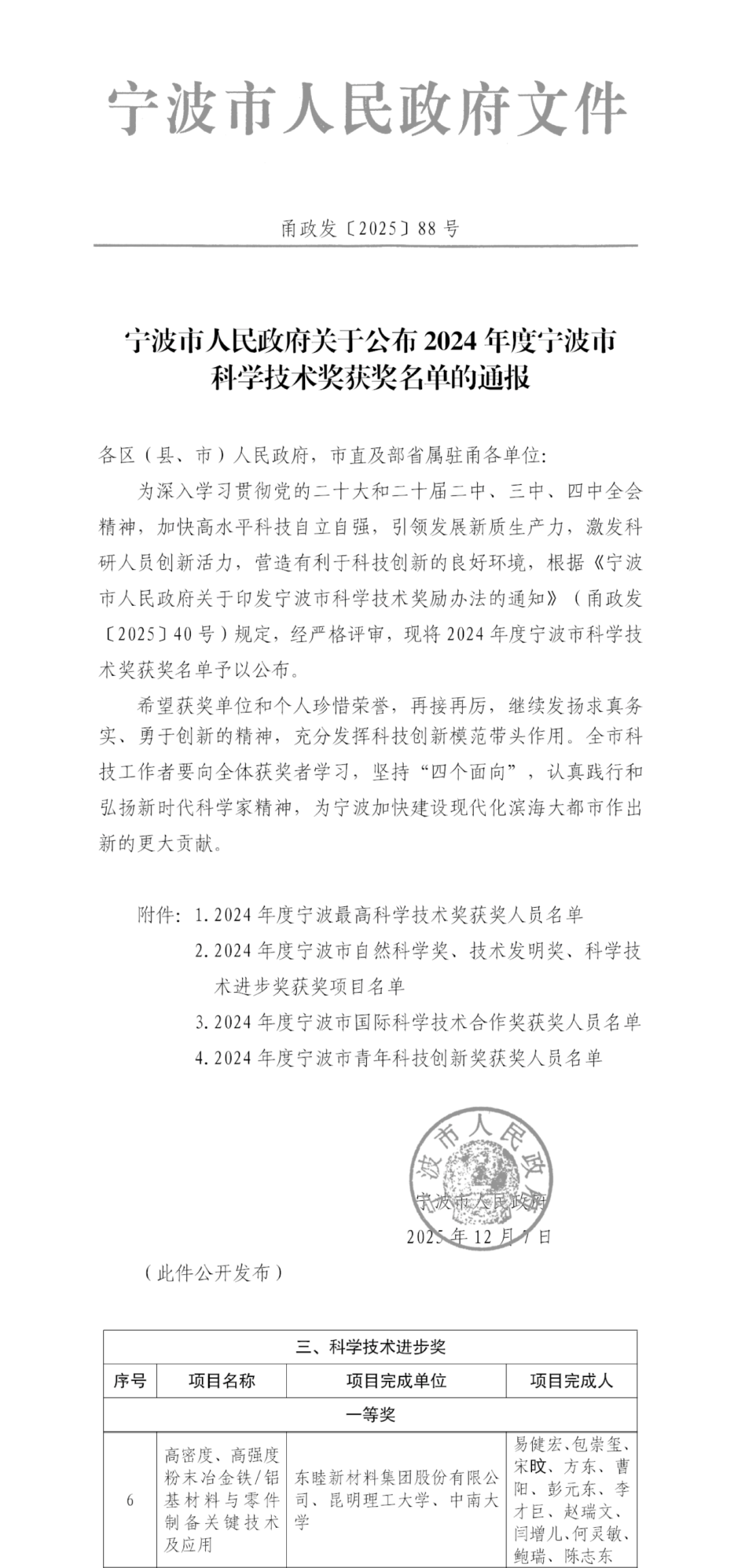 2025年12月9日,2024年度宁波市科学技术进步奖评选结果揭晓,东睦新材料集团股份有限公司(以下简称“公司”)作为第一完成单位的“高密度、高强度粉末冶金铁/铝基材料与零件制备关键技术及应用”项目,荣获宁波市科学技术进步奖一等奖。