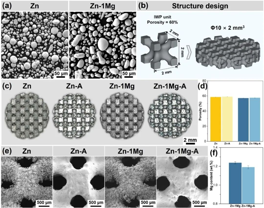 为破解这一难题,清华大学、中国人民解放军总医院第四医学中心、北京大学联合团队聚焦支架表面特性与成骨性能关联机制展开研究。团队采用PBF-LB/M技术制备纯锌(Zn)和锌-1镁(Zn-1Mg)多孔支架,结合酸蚀刻调控表面特性,通过一系列表征分析及性能测试,全方位解析了表面特性对成骨的调控作用。