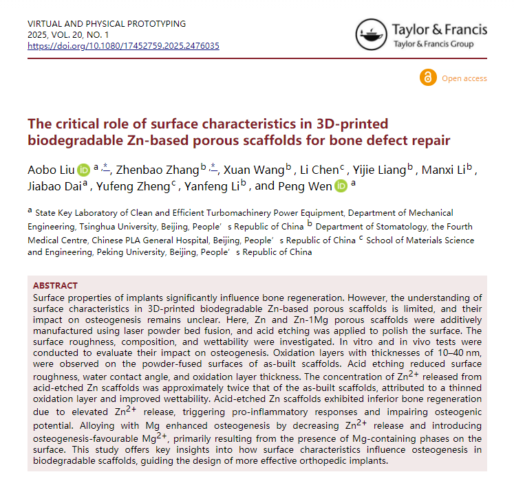本文通讯作者为清华大学温鹏副教授、中国人民解放军总医院第四医学中心李岩峰教授与北京大学郑玉峰教授。上述研究成果以“ The critical role of surface characteristics in 3D-printed biodegradable Zn-based porous scaffolds for bone defect repair”为题,发表于工程技术领域权威期刊Virtual and Physical Prototyping。目前,该期刊的影响因子为10.2。