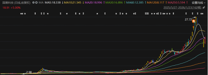 受前期涨幅过高、交易被监管重点监控影响,1月15日至21日,国晟科技连续5个交易日跌停,股价从27.72元/股的高位跌至16.37元/股,区间换手率仅11.72%。