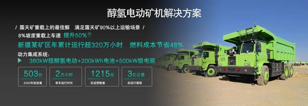 自2023年初开始,醇氢电动矿机在新疆矿区首批投放350台,截至2025年,配套汉马醇氢电动系统的矿机累计运营已达1215台,设备单机运行时长最高突破2万小时,累计运行里程达3亿公里,充分印证了醇氢电动矿卡解决方案的可靠性与规模化应用价值。