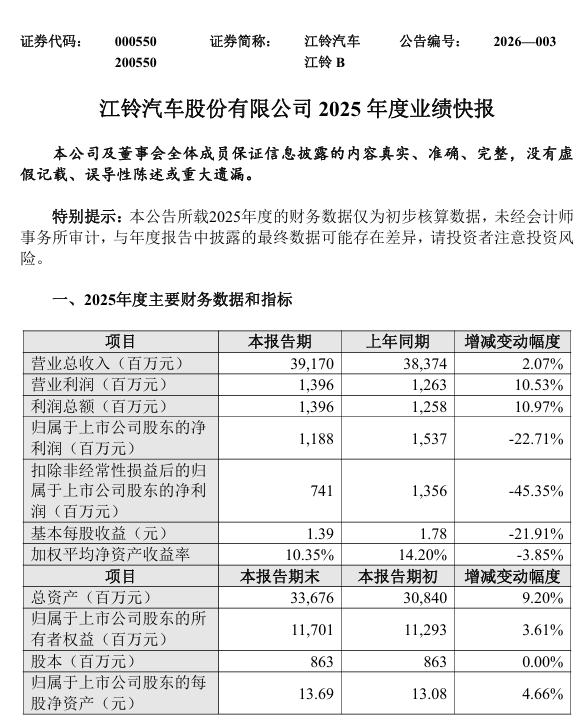 2025 年,江铃汽车实现营业收入 391.70 亿元,同比增长 2.07%。2025 年度归属于上市公司股东的净利润 11.88 亿元,同比下降 22.71%;扣除非经常性损益后的归属于上市公司股东的净利润 7.41 亿元,同比下降 45.35%;以上变化主要是由于公司控股子公司江铃福特汽车科技(上海)有限公司进行业务调整,相应转回已确认的递延所得税资产。