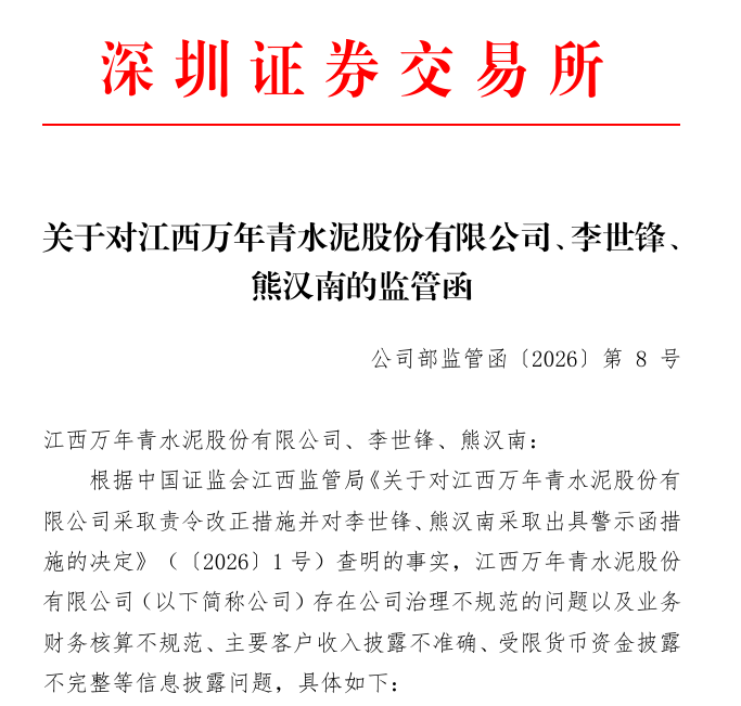 根据深交所在2026年1月23日发布的公告,万年青(000789)及其时任总经理李世锋、财务总监兼董事会秘书(代行)熊汉南收到监管函。