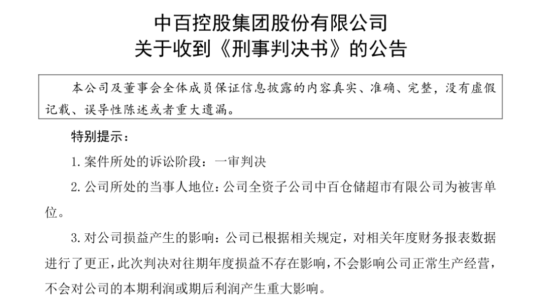 中百集团表示,公司已根据相关规定,对相关年度财务报表数据进行了更正,此次判决对往期年度损益不存在影响。此次判决不会影响公司正常生产经营,不会对公司的本期利润或期后利润产生重大影响。本次刑事判决仅为一审判决,目前判决尚未生效。