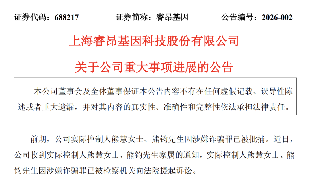 1月23日晚间,睿昂基因发布公告称,近日,公司收到实际控制人熊慧、熊钧家属的通知,熊慧、熊钧因涉嫌诈骗罪已被检察机关向法院提起诉讼。前期,上述二人因涉嫌诈骗罪被批捕。
