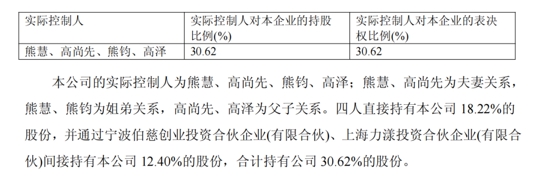 据睿昂基因2025年半年报,公司实际控制人为熊慧、高尚先、熊钧、高泽。熊慧、熊钧为姐弟关系,高尚先、高泽为父子关系。四人直接持有本公司18.22%的股份,并通过宁波伯慈创业投资合伙企业(有限合伙)、上海力漾投资合伙企业(有限合伙)间接持有公司12.40%的股份,合计持有公司30.62%的股份。