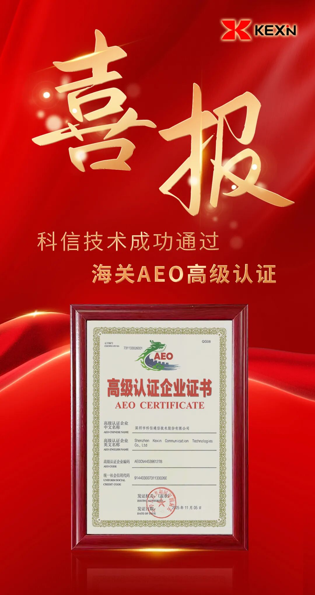 近日,科信技术(300565)成功通过海关AEO(Authorized Economic Operator,经认证的经营者)高级认证。依托AEO国际互认优势,不仅为跨境业务打通便捷通道、有效降低仓储物流成本,更进一步提升了为全球客户提供稳定、便捷、高效交付服务的能力。