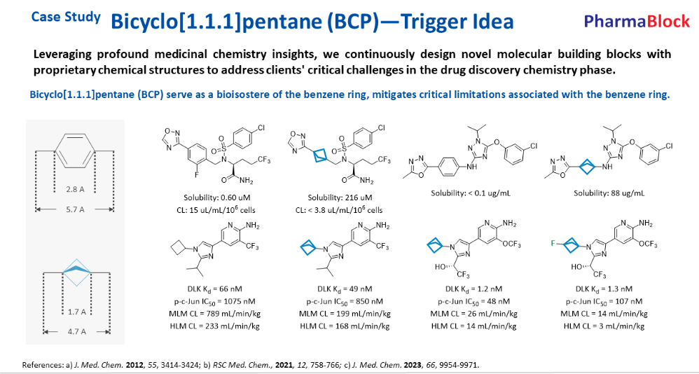 针对传统苯环药效团在药物分子中易引发的溶解性差、亲脂性过高、代谢稳定性不足等理化短板,药石科技依托深厚的药物化学洞察,开发了双环[1.1.1]戊烷(BCP)等一系列非经典苯环生物电子等排体。其中BCP可作为苯环的理想替代结构,能在维持药物靶点结合活性的同时,有效改善分子的ADME性质,仅BCP类砌块就已设计并生产超2000种结构多样的产品,同时还覆盖双环[2.1.1]己烷、双环[2.2.2]辛烷等多种类型的替代砌块。在杂芳环领域,药石科技储备了品类丰富且具备高类药性的产品体系,包含氨基嘧啶、吡咯并嘧啶等骨架,可充分满足各类激酶抑制剂的ATP口袋铰链结合骨架需求,为激酶抑制剂类药物的研发提供了核心结构支撑。