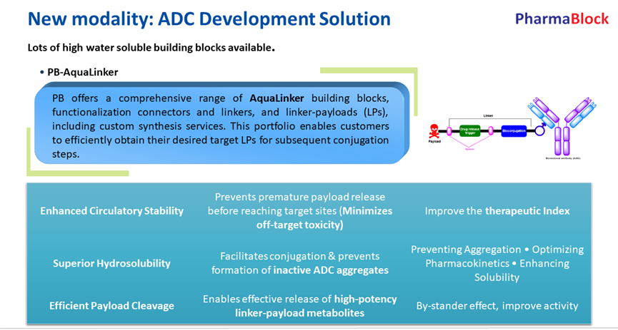 药石科技围绕ADC药物研发的核心痛点搭建了PB-XDC专属技术平台,形成覆盖Linker、Payload、偶联及产业化的全链条解决方案。其中PB-AquaLinker高水溶性技术平台通过在连接子关键区域引入糖基化片段、PEG、PSAR等亲水基团形成疏水屏蔽,可有效降低ADC聚集率、提升循环稳定性;Payload领域不仅覆盖了微管蛋白抑制剂、喜树碱类等主流类型,还前瞻性布局了双Payload ADC等复杂分子,同时还提供Linker-Payload预制产品以加速早期研发进程。在偶联技术上,PB-SiteClick定点偶联平台依托酶促偶联、糖工程化抗体及选择性巯基偶联技术,可精准控制DAR值并提升ADC均质性。此外,浙江晖石基地的GMP高活原料药(OEB-5)生产线可实现高活原料药的GMP生产,曾成功攻克高难度Linker-Payload合成项目,为客户项目的快速推进提供了关键支撑。