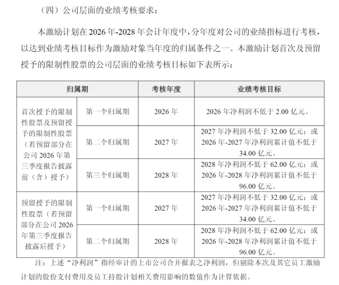 两份计划中的公司层面业绩考核目标相同,均为2026年净利润不低于2亿元;2027年净利润不低于32亿元,或2026年至2027年净利润累计值不低于34亿元;2028年净利润不低于62亿元,或2026年至2028年净利润累计值不低于96亿元。