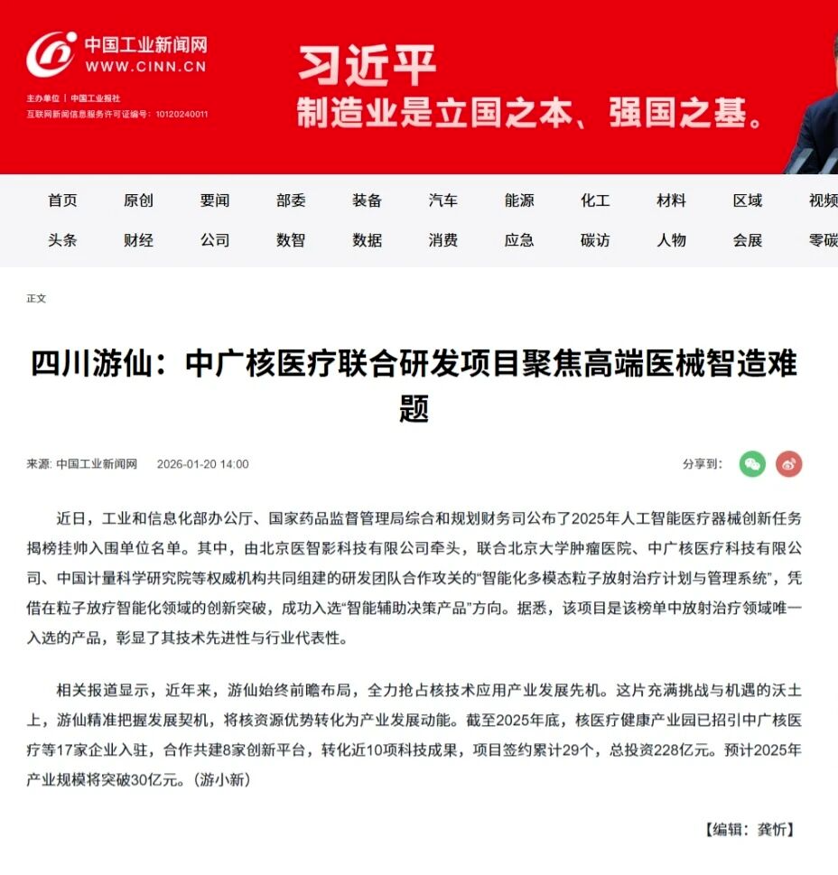 此前,由中广核医疗科技(绵阳)有限公司参与的联合研发项目,入选工业和信息化部办公厅、国家药品监督管理局综合和规划财务司联合公布的2025年人工智能医疗器械创新任务揭榜挂帅入围单位名单。该项目聚焦解决高端医疗器械智能制造领域的关键难题,并获得中国工业新闻网报道