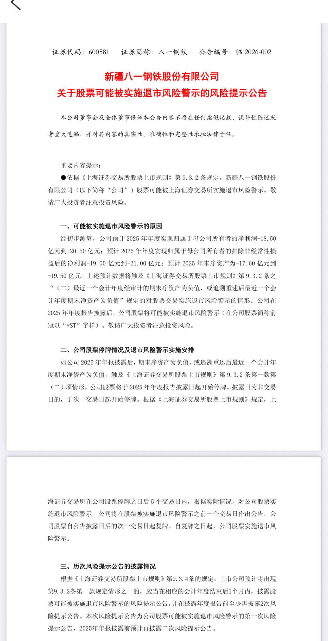 八一钢铁1月25日晚同步公告,上述预计数据将触及《上海证券交易所股票上市规则》第9.3.2条之“(二)最近一个会计年度经审计的期末净资产为负值,或追溯重述后最近一个会计年度期末净资产为负值”规定的对股票交易实施退市风险警示的情形。公司在2025年年度报告披露后,公司股票将可能被实施退市风险警示(在公司股票简称前冠以“*ST”字样)。