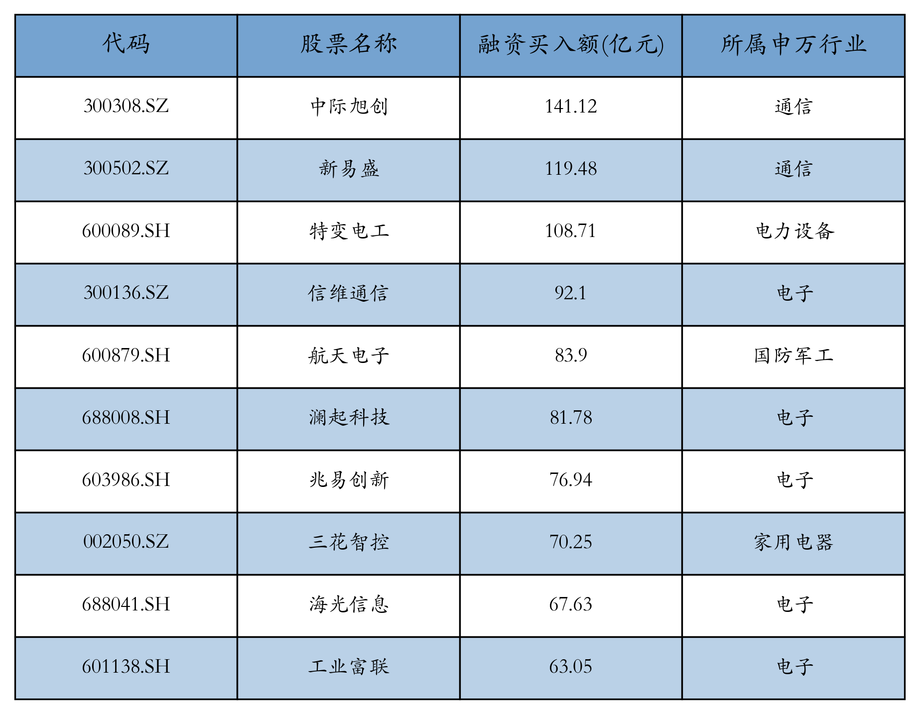 上周两市共有3481只个股有融资资金买入,共有261只个股买入金额超10亿元,其中中际旭创(300308)、新易盛(300502)、特变电工(600089)排名前三,买入金额分别141.12亿元、119.48亿元、108.71亿元。融资买入额前10个股详情见下表: