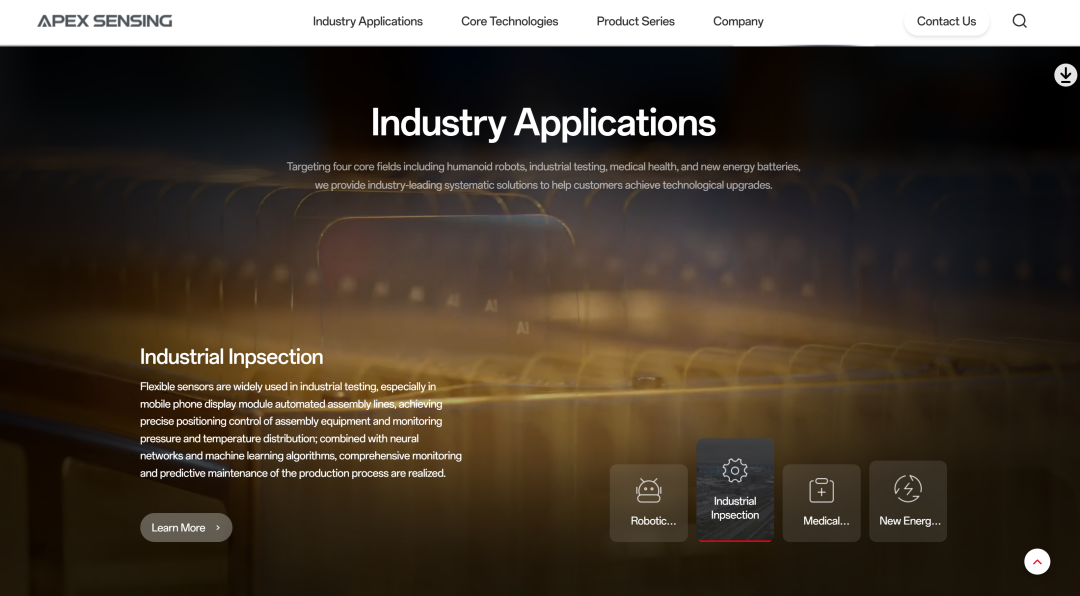 本次新上线的官网,定位Apex Sensing与全球客户、行业合作伙伴沟通的核心数字窗口。客户通过该网站即可深入了解公司概况,技术优势,机器人触觉与电子皮肤、工业检测、医疗健康检测、新能源电池检测等四大领域精密触觉传感技术及相应产品体系。