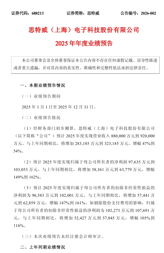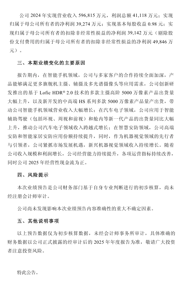 利润方面,思特威预计 2025 年度实现归属于母公司所有者的净利润 9.76 亿元到 10.31 亿元,同比增幅 149% 到 162%。