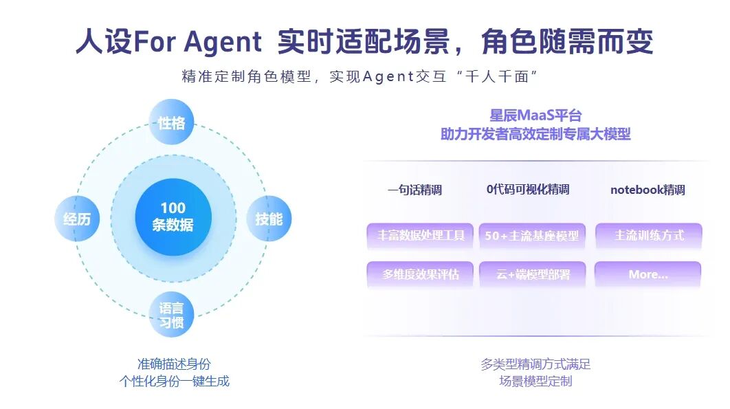 通过星辰MaaS的一句话精调模式,只需通过 “性格、经历、技能、语言习惯” 几个维度的精准描述,系统即可生成100条场景数据,自动定制场景的角色模型,实现Agent交互的千人千面,除了一句话精调,星辰MaaS基于高效的工具链+丰富的基座模型,还提供0代码可视化精调、notebook精调,满足Agent各个环节的效果精调,提升效果、效率的同时降低成本,助力应用规模化增长。
