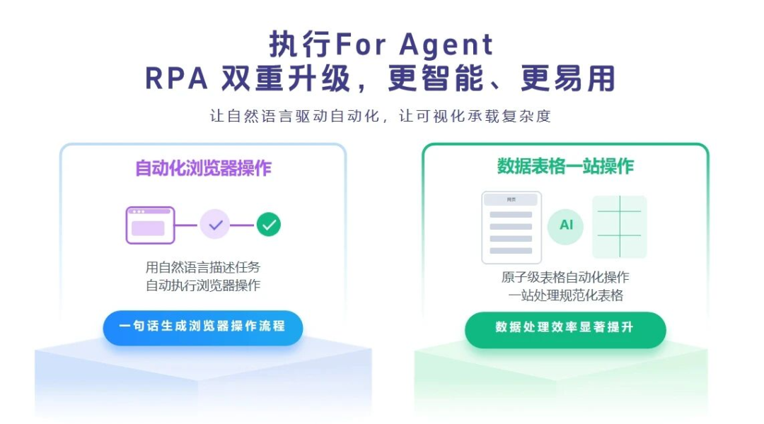 智能组件:通过自然交互即可生成“可配置、可重复执行”自动化组件,应用于网页自动化和基础的数据、文本处理场景,极大地降低自动化能力的创造门槛。