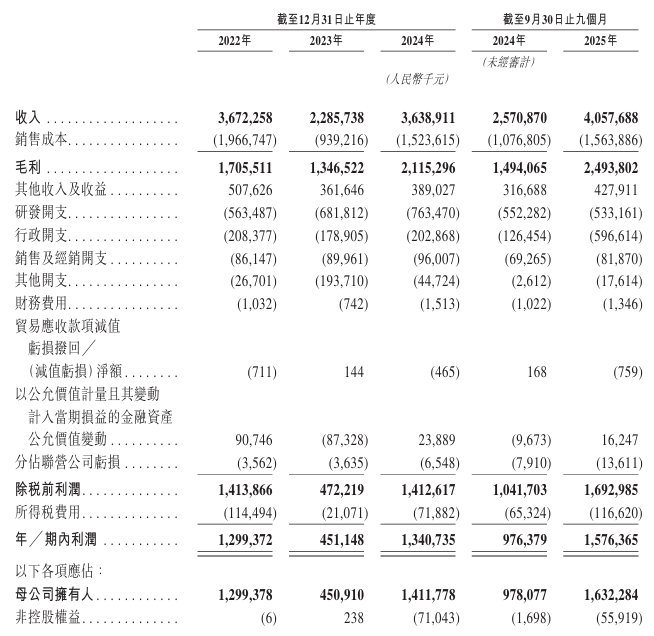 财务方面,于2022年度、2023年度、2024年度、2025年截至9月30日止九个月,公司分别录得收入36.72亿元(人民币,下同)、22.86亿元、36.39亿元、40.58亿元;同期,录得年╱期内利润12.99亿元、4.51亿元、13.41亿元、15.76亿元。