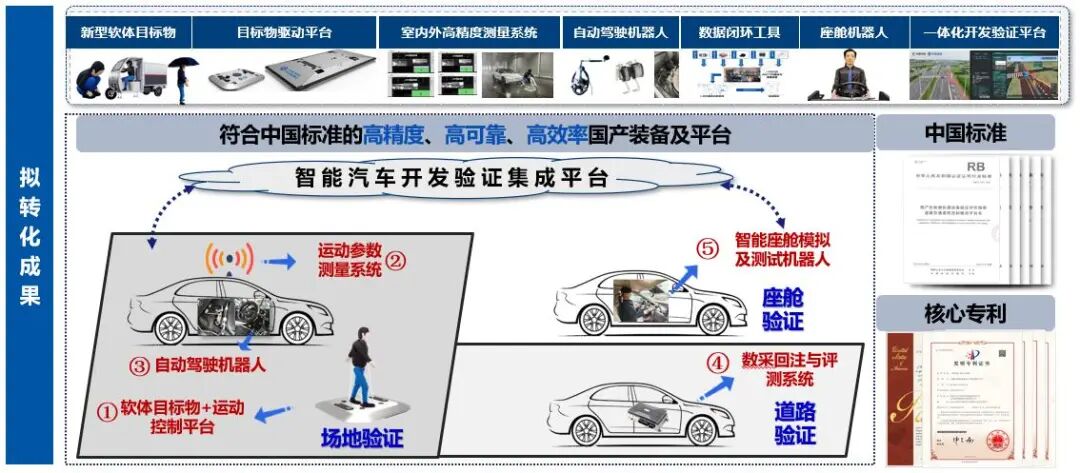 “智能汽车开发验证技术及装备”项目由中国汽研牵头承担,目前已研发软体目标物、驱动平板、室内外一体化高精度定位系统、驾驶/座舱机器人、数据采集系统、场景转换与自动驾驶算法测评工具链、云控一体化平台等系列国产验证装备,构建了“场地验证-道路验证-座舱验证-集成验证”多维度智能汽车开发验证体系,打造形成了自主可控装备产业生态,打破国外技术垄断并实现核心装备出口,为我国智能汽车产品验证及产业化应用提供关键支撑。