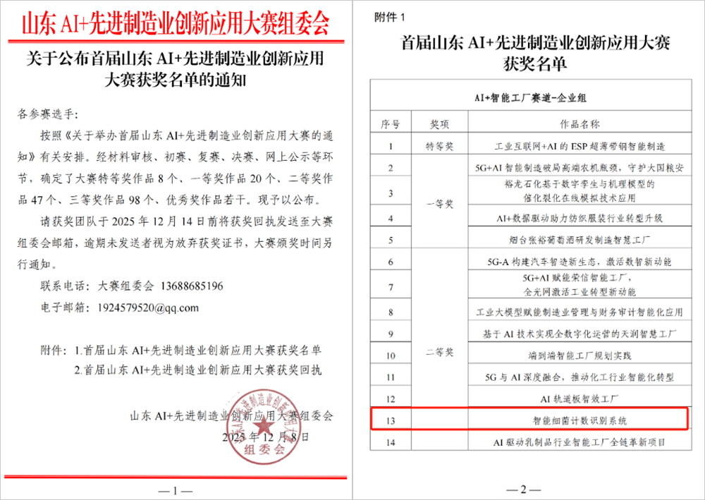 日前,在刚刚落下帷幕的首届山东AI+先进制造业创新应用大赛决赛中,我公司自主研发的“智能细菌计数识别系统”从众多优秀参赛项目中脱颖而出,凭借显著的技术先进性与突出的应用价值,荣膺大赛二等奖。