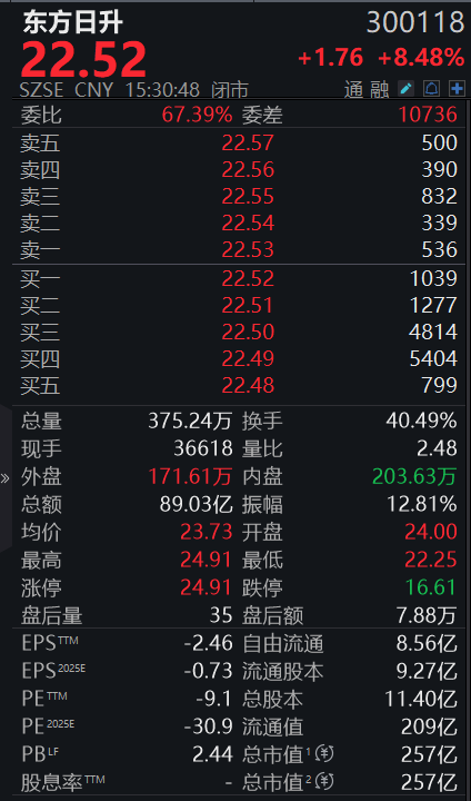 截至今日收盘,东方日升股价报22.52元/股,上涨8.48%。