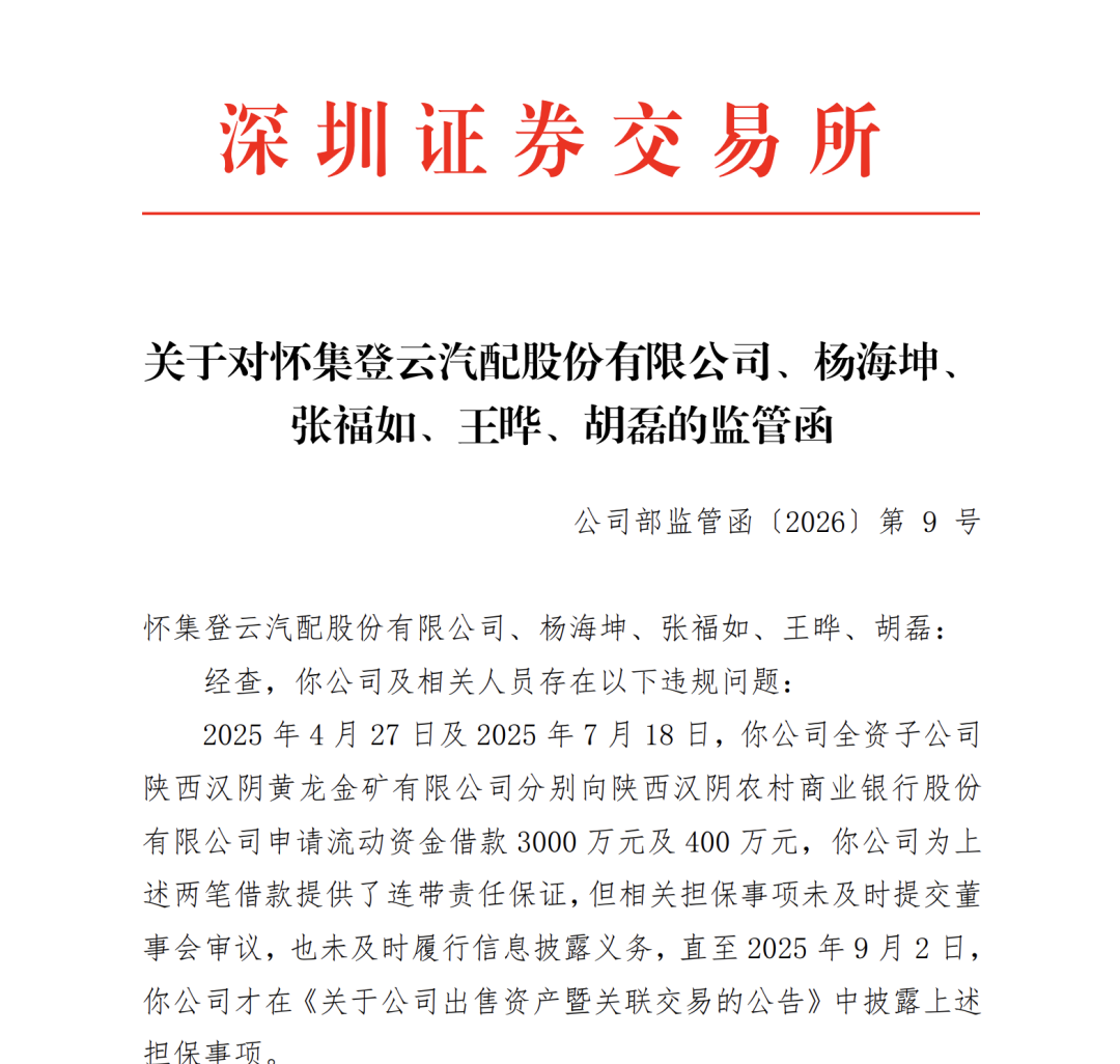 监管函显示,2025年4月27日及2025年7月18日,登云股份全资子公司陕西汉阴黄龙金矿有限公司分别向陕西汉阴农村商业银行股份有限公司申请流动资金借款3000万元及400万元,登云股份为上述两笔借款提供了连带责任保证,但相关担保事项未及时提交董事会审议,也未及时履行信息披露义务,直至2025年9月2日才在《关于公司出售资产暨关联交易的公告》中披露上述担保事项。