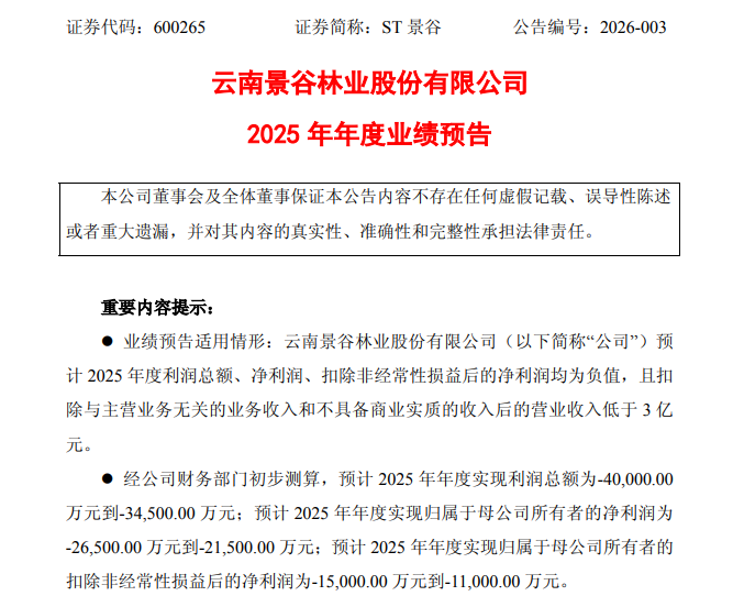ST景谷(600265)(600265)1月26日晚公告,经公司财务部门初步测算,预计2025年年度实现利润总额为-4亿元到-3.45亿元;预计2025年年度实现归属于母公司所有者的净利润为-2.65亿元到-2.15亿元;预计2025年年度实现归属于母公司所有者的扣除非经常性损益后的净利润为-1.5亿元到-1.1亿元。