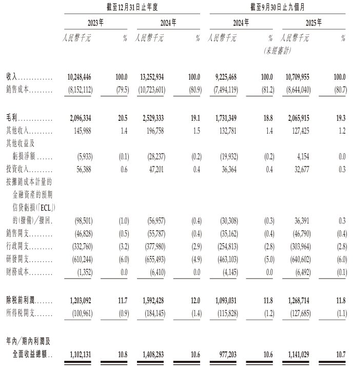 2023年度、2024年度及2025年截至9月30日止九个月,该公司年内╱期内利润及全面收益总额分别约为11.02亿元、14.08亿元、11.41亿元人民币。