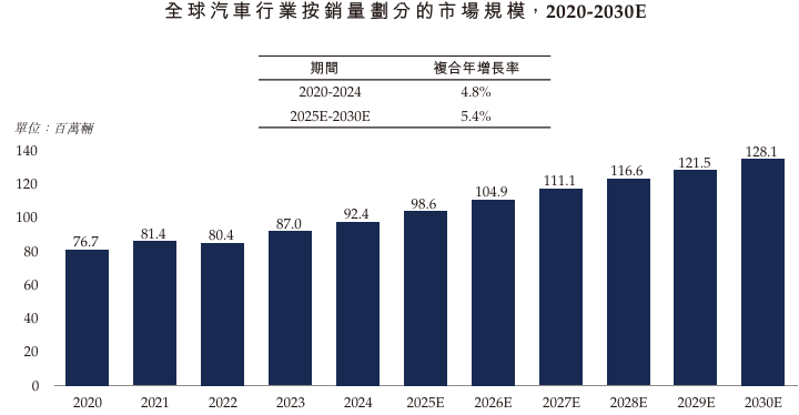 2020-2024年全球汽车销量从7670万辆增长至9240万辆,复合年增长率达4.8%。2025-2030年,随着新能源汽车渗透率提高、智能化与网联化技术推动产品升级与消费结构优化、新兴市场需求持续释放以及供应链韧性增强,预计全球汽车销量将增长至1.28亿辆,复合年增长率为5.4%。