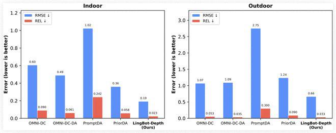 LingBot-Depth模型基于奥比中光Gemini330系列双目3D相机提供的芯片级原始数据研发。在NYUv2、ETH3D等权威评测中,其相对误差降低超70%,稀疏深度补全任务RMSE误差下降约47%。