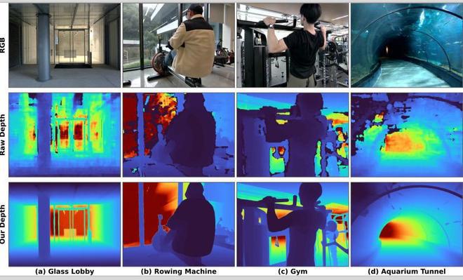 针对家庭和工业环境中常见的玻璃器皿、镜面、不锈钢设备等透明和反光物体,传统深度相机常因光学物理特性导致深度图数据丢失或产生噪声。据悉,蚂蚁灵波科技研发了“掩码深度建模”(Masked Depth Modeling,MDM)技术。当深度数据出现缺失或异常时,LingBot-Depth模型能够融合彩色图像(RGB)中的纹理、轮廓及环境上下文信息,对缺失区域进行推断与补全,输出相对完整、致密的三维深度图。