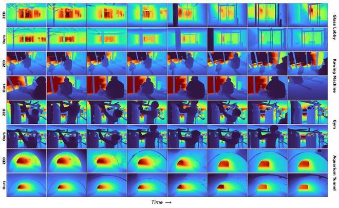 实验显示,奥比中光Gemini330系列在应用LingBot-Depth后,面对透明玻璃、高反光镜面等场景时,输出的深度图在平滑度、完整性及物体轮廓边缘清晰度上有所提升。