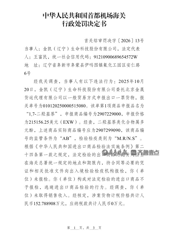 近日,中华人民共和国首都机场海关发布行政处罚决定书(首关综审罚决字〔2026〕13 号)。