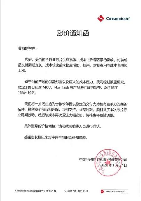 IT之家注意到,通知函称,鉴于当前严峻的供需形势以及巨大的成本压力,经过慎重研究,决定于即日起对 MCU、Norflash 等产品进行价格调整,涨价幅度 15%~50%。