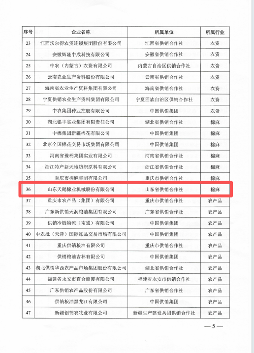 近日,中华全国供销合作总社办公厅印发通知,正式公布“供销合作社骨干龙头企业培育名录”。山东天鹅棉业机械股份有限公司凭借其行业领先地位与综合实力,成功入选该名录。