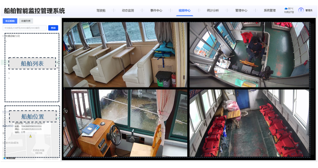 视频中心:提供船舶的实时监控调阅,支持视频叠加场景名称、船舶名称、定位坐标时间与航速信息。